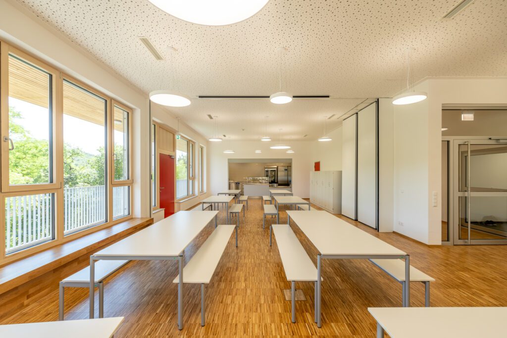 Das neue Gebäude ist optimal an das schmale, am Hang gelegene Grundstück angepasst. Es erstreckt sich über drei Etagen und nutzt den reduzierten Raum bestmöglich. Im Erdgeschoss befinden sich der Speisesaal und Räume für die Ganztagsbetreuung. Die beiden oberen Stockwerke, die über das Erdgeschoss hinausragen, beherbergen die Klassenräume und bieten einen beeindruckenden Ausblick über Aschfeld und das Tal.